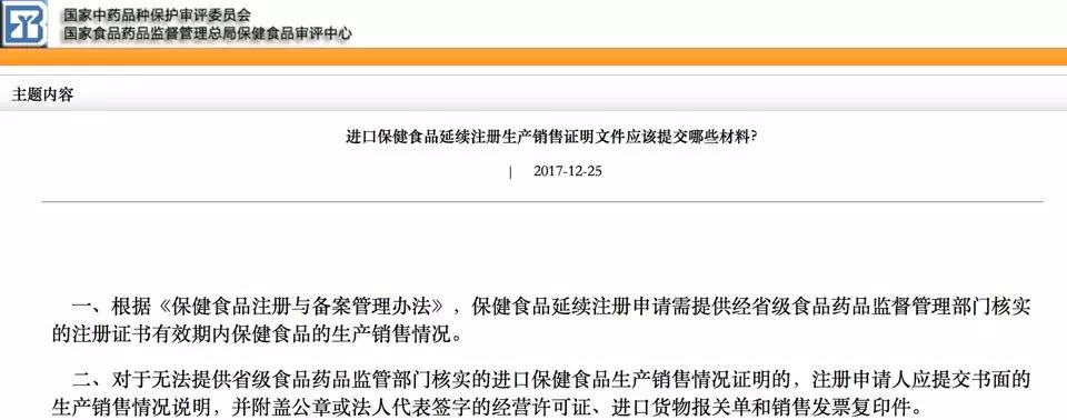 12月25日,CFDA保健食品审评中心官网发文《进口保健食品延续注册生产销售证明文件应该提交哪些材料?》,该文明确——